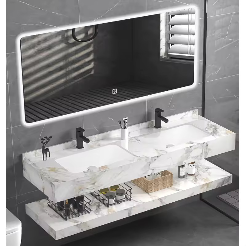 Double Basins Sink Vanity erbjuder gott om utrymme för alla dina vårdbehov, vilket gör det till ett idealiskt val för större badrumsutrymmen eller för familjer som delar ett badrum. LED -spegeln lägger till en modern touch och ger riklig belysning för rakning, smink eller helt enkelt redo för dagen.
